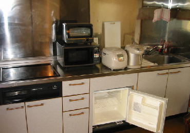 キッチンには、普段家庭で使用している調理器具がそろっています。 IHクッキングヒーター・ 炊飯器・電気ポット・電子レンジ・オーブントースター・まな板・包丁・なべ・フライパン・冷蔵庫と特別な 調理以外には対応できると思います。(調味料・サラダ油はご用意ください。)